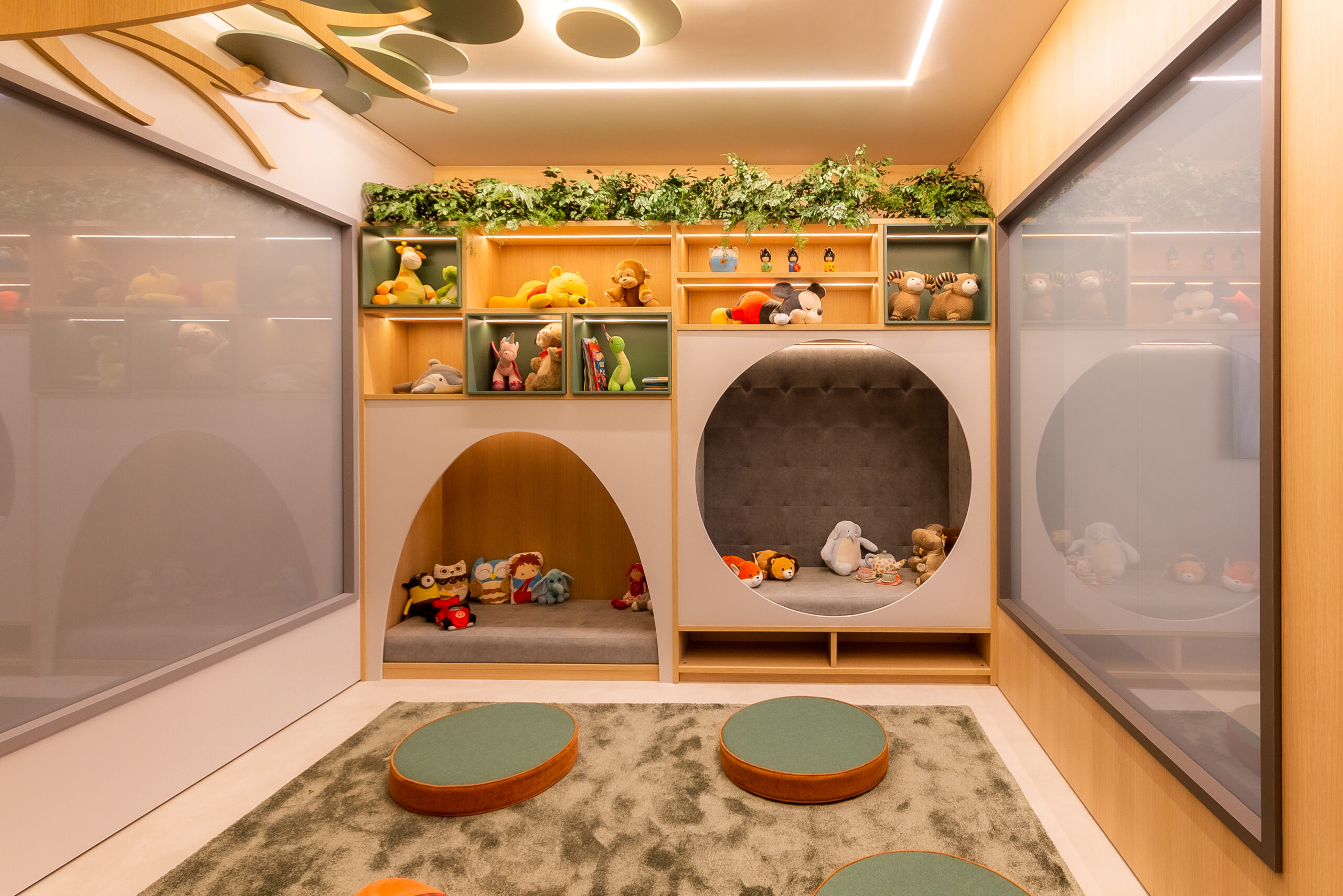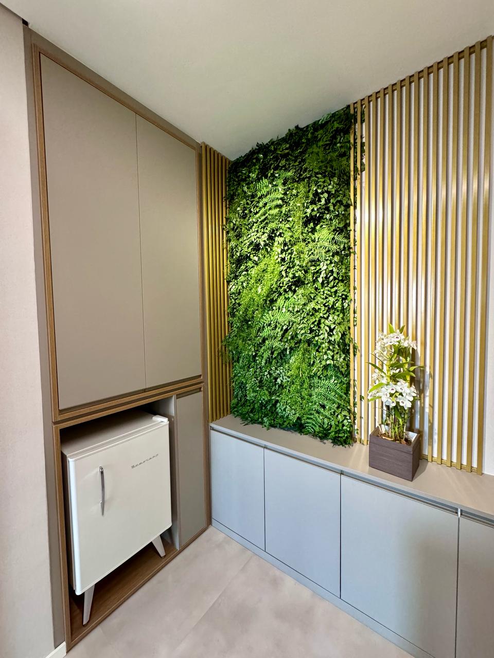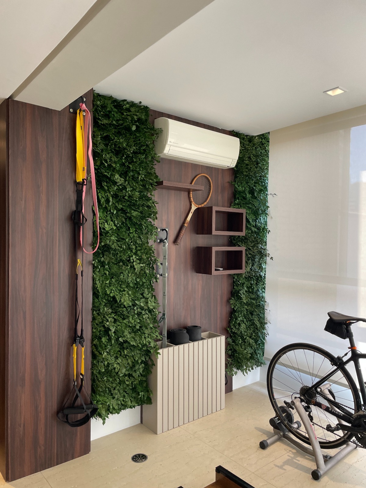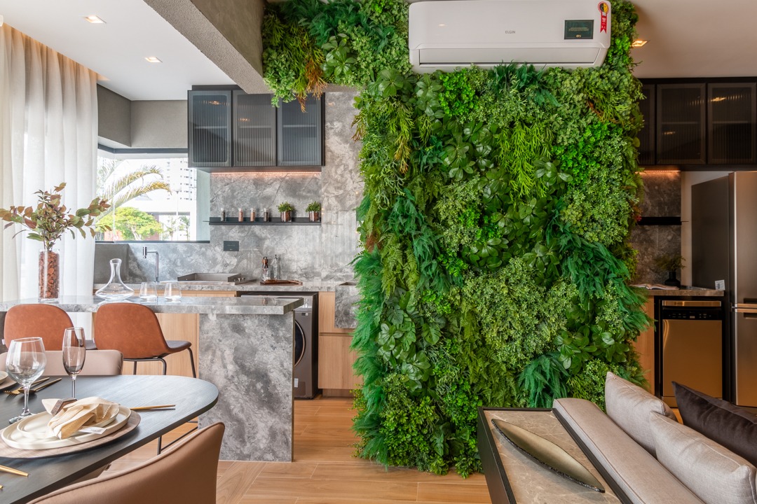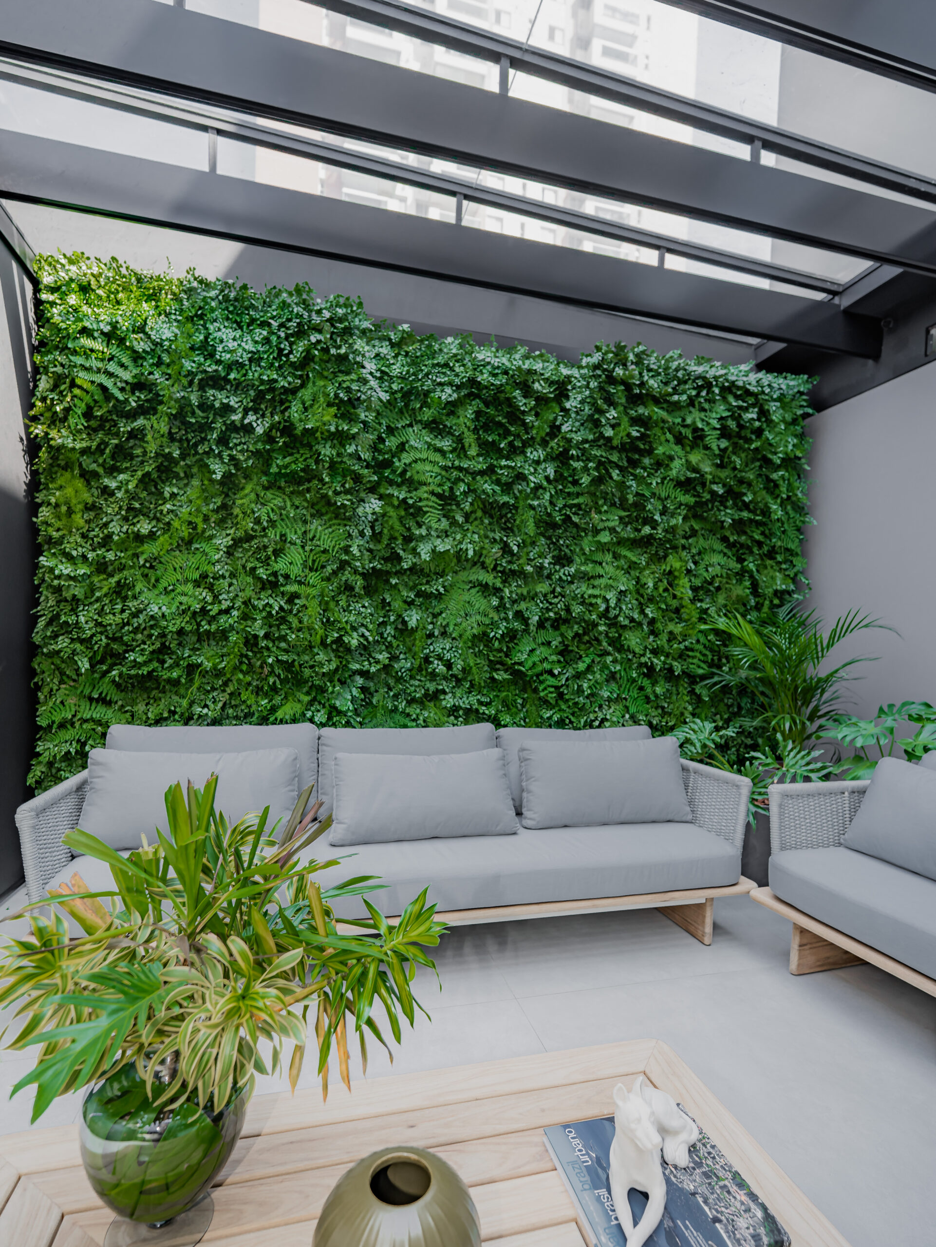 Os jardins verticais, floreiras e composições vegetais são desenvolvidos conforme as condições ambientais do local, considerando iluminação, irrigação e manutenção.